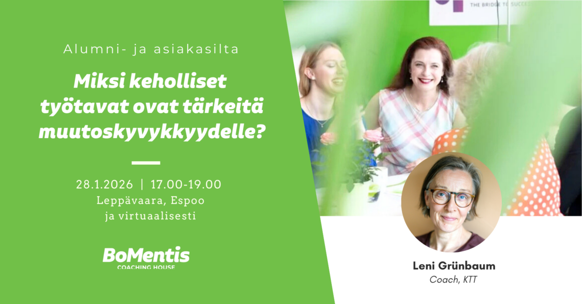Tilaisuus on maksuton ja se pidetään paikan päällä BoMentis – Coaching Housen tiloissa Linnoitustie 4 A:ssa, Espoossa. Voit osallistua myös etänä.