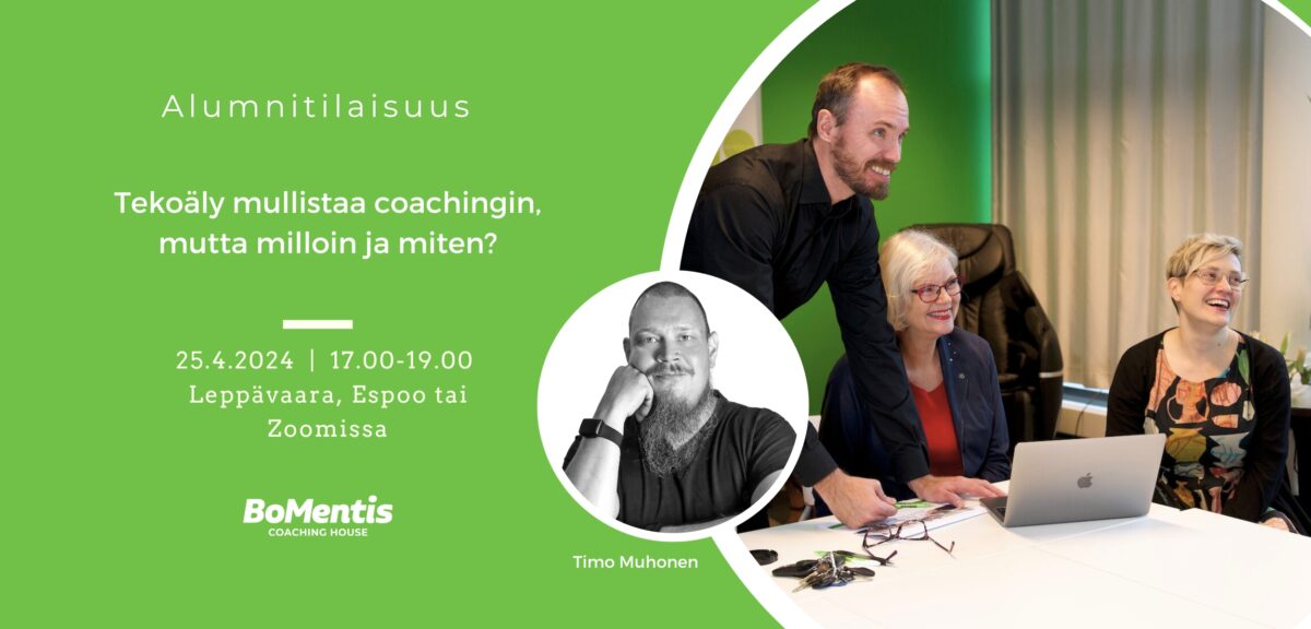 Tervetuloa seuraavaan alumnitilaisuuteemme to 25.4.2024 klo 17 alkaen. Illan aikana pureudumme kysymykseen ”Miten ja milloin tekoäly mullistaa coachingin?” yhdessä alumnimme Timo Muhosen johdolla.